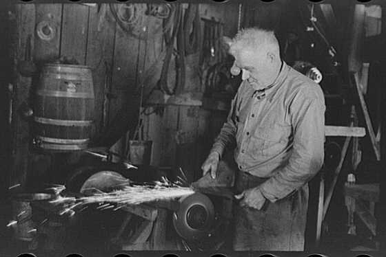 Blacksmith sharpening cultivator point south of Marshall, Texas.