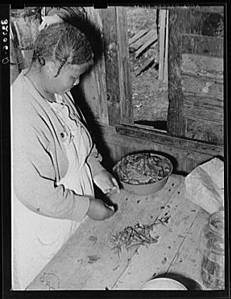 Negro woman, wife of sharecropper, preparing "poke-salad." This is a green which grows wild in the South and which Southern Negroes and many of the whites consider an essential spring tonic. Near Marshall, Texas.