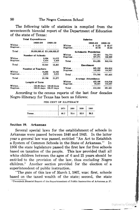 The following table of statistics is complied from the seventeenth biennial report of the Department of Education of the state of Texas.
